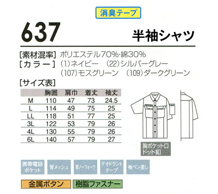 消臭テープの効果で、清涼感もUP! 作業服の商品詳細 品 番 桑和 637 シーズン 春夏用 素 材 ポリエステル70%・綿30% カラー 1 ネイビー 22 シルバーグレー 107 モスグリーン 109 ダークグリーン 涼しい 吸汗速乾 ソフト加工 イージーアイロン 機能詳細一覧はこちら 作業服の上下セットを選ぶ際は同シリーズからお選び下さい。