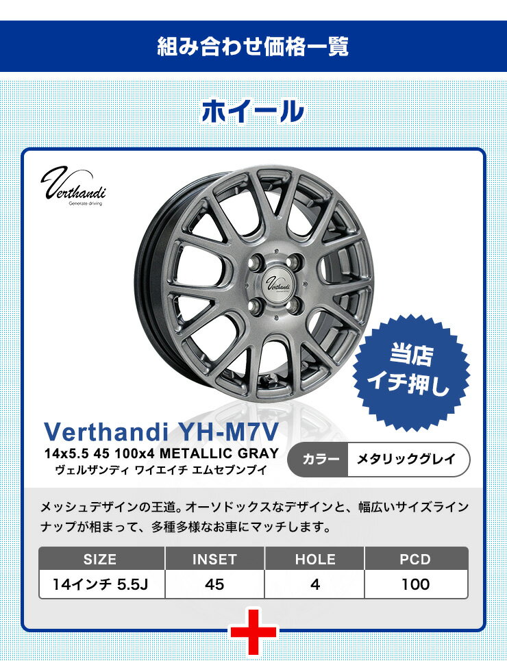 商品名■スタッドレスタイヤが選べるセット 175/65R14商品説明 対象ホイールVerthandi YH-M7V(ヴェルザンディ ワイエイチ・エムセブンブイ) M/G(メタリックグレイ)メッシュデザインの王道。