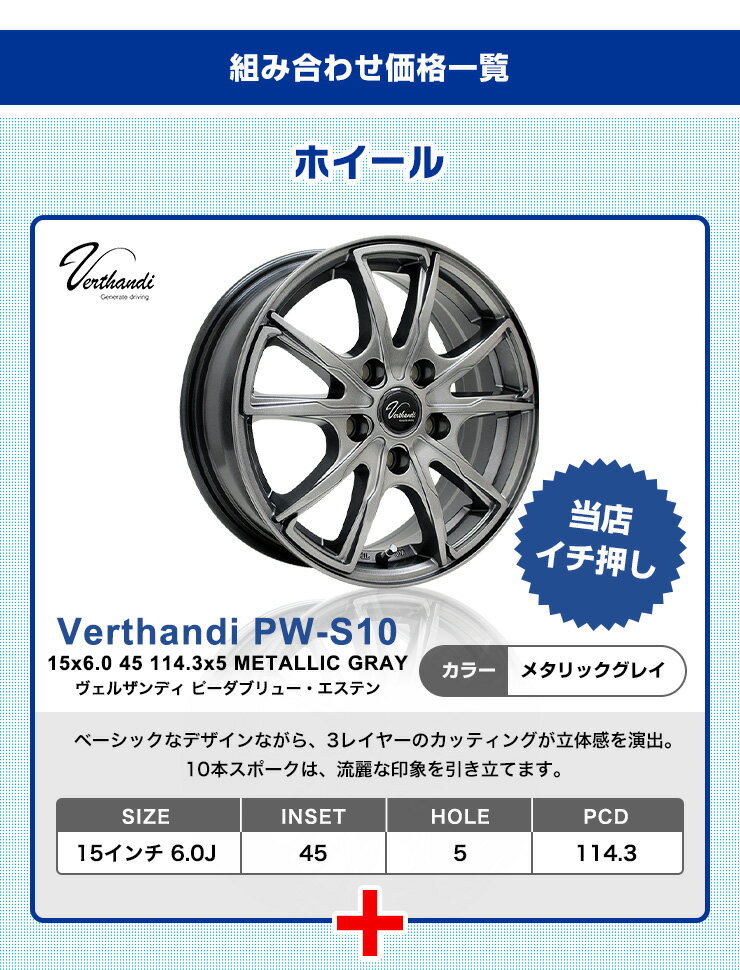 商品名■スタッドレスタイヤが選べるセット 195/65R15商品説明 対象ホイールVerthandi PW-S10 15x6.0 45 114.3x5 METALLIC GRAY ベーシックなデザインながら、3レイヤーのカッティングが立体感を演出。