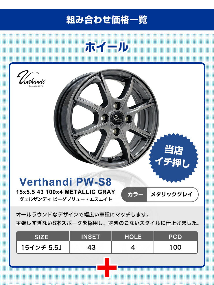 商品名■スタッドレスタイヤが選べるセット 175/65R15商品説明 対象ホイールVerthandi PW-S8(ヴェルザンディ ピーダブリュー・エスエイト)M/G(メタリックグレイ) オールラウンドなデザインで幅広い車種にマッチします。