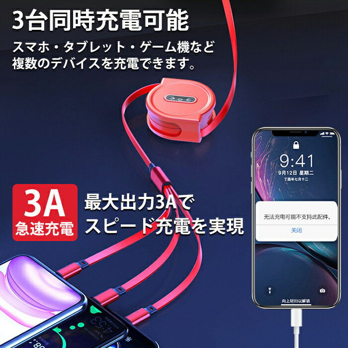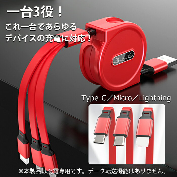 3in1 充電ケーブル Lightning Micro USB Type-C ライトニングケーブル microusb typec スマホ iPhone Android アイフォン アンドロイド ケーブル 充電器 同時 充電 充電コード 巻き取り式 USBケーブル データ転送 急速充電 おしゃれ【送料無料】###ケーブル1-USB-###