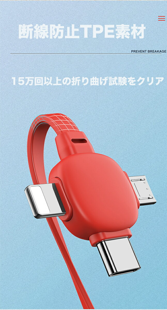 商品情報商品名3in1 充電ケーブル iphone/android/type-c 3A長さ20cm-120cmまで、5段階の長さを調整出来ます。
