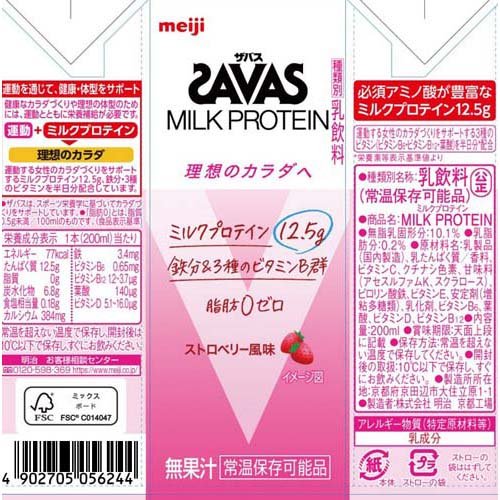 お店TOP>健康食品>プロテイン>プロテイン容量・タイプ別>プロテインドリンク>明治 ザバス ミルクプロテイン MILK PROTEIN ストロベリー風味 (200ml*48本セット)商品区分:乳類【明治 ザバス ミルクプロテイン MILK PROTEIN ストロベリー風味の商品詳細】●カラダづくりに適したミルクプロテインを12.5gと運動する女性に必要な3種のビタミンB群と鉄分を配合し、すっきりと飲みやすい優しいストロベリー風味なので、運動後に摂取することで、女性のカラダづくりをサポートします。