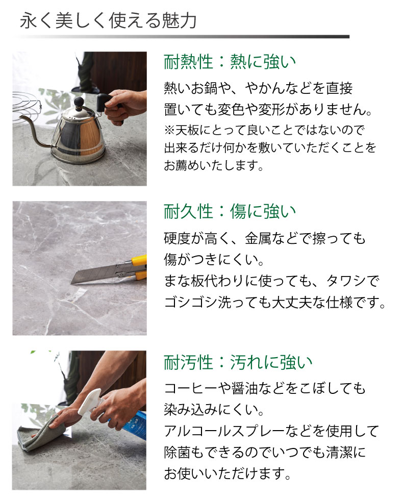 ステレンスや人造大理石よりも高い強度をもつと言われています。